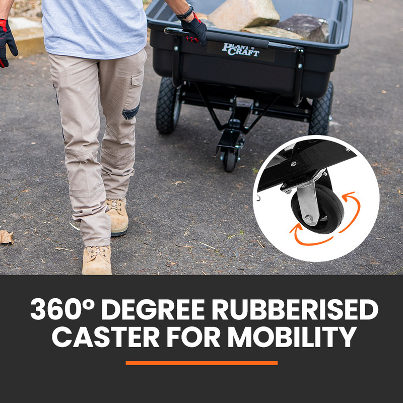This PlantCraft dump cart's innovative and lightweight design allows you to fold up the tow bar and extend the handle to convert the dump cart to a wheelbarrow. It also has an additional swivel castor to make pushing heavy loads easier on hard surfaces. PlantCraft Dump Carts are designed with essential features and minimal moving components - which adds up to sensibly priced quality that lasts you longer.