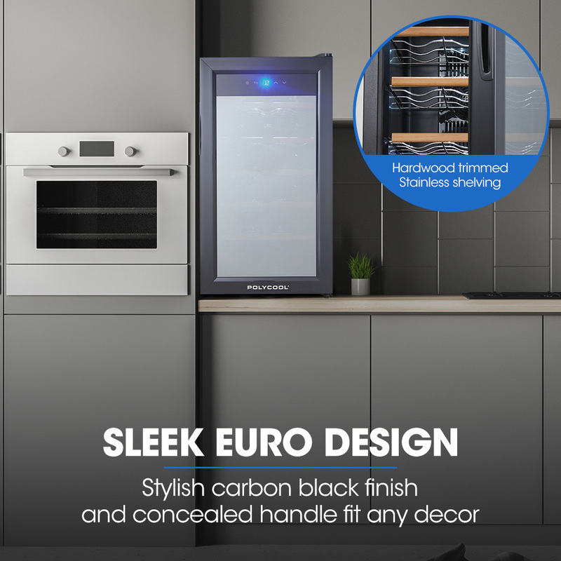 The PolyCool Noir 18 Bottle Countertop Wine Chiller Fridge is everything you need to enjoy your favourite vintages anytime. With an ample 47L capacity, you'll be ready for any special occasion be it big or small, or just wine o??lock on a regular day.