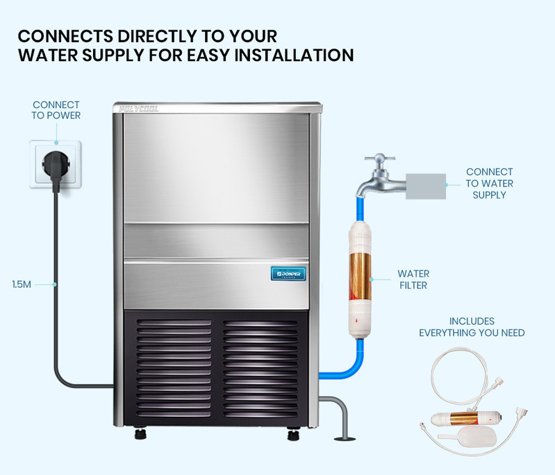 POLYCOOL Commercial Automatic Ice Cube Maker, Free Standing Stainless Steel Ice Machine, 410 Grade