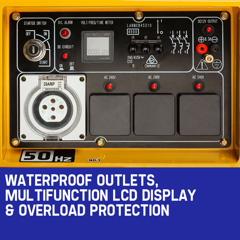 - Continuous Rated Output from 20amp 415V outlet: 5000W / 5kW / 5kW