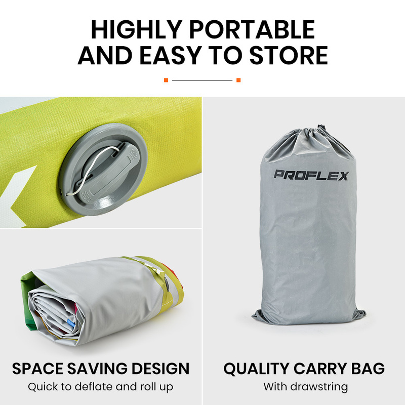 4 reinforced handles and the lightweight design allow you to easily transport your Air Track to wherever you need it. After deflation, the Air Track can be quickly rolled up and easily carried or stored in the included Proflex drawstring carry bag.