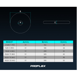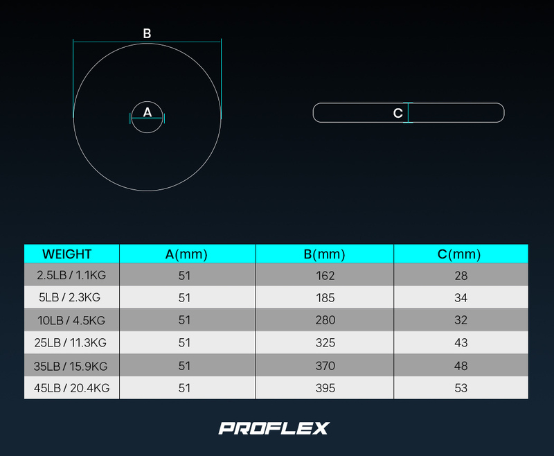 The JusBfit Series launched by Proflex is true commercial-grade gear that makes it ideal for anyone looking for gear that will stand the test of time. The range of Olympic Weight Plates are heavy-duty in structural integrity with one-piece forged construction and ergonomically engineered for comfortable and safe handling. They feature ultra-rugged, split, crack and peel resistant rubber casings to protect your floors and other equipment. The steel inner rings allow the weights to easily slide along an Olympic bar.