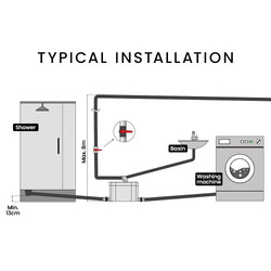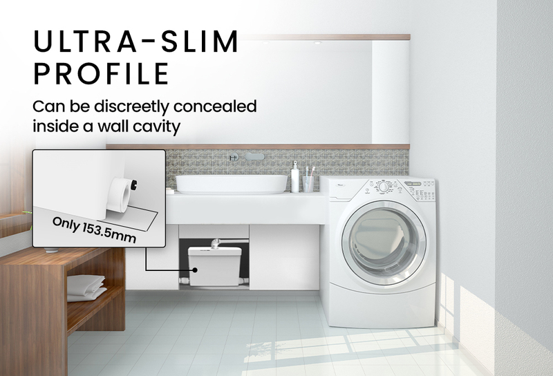 The Protege Laundrylink Slim is ultra-slim with a depth of only 153mm. It is designed for the laundry area and can connect with up to 3 sanitary fixtures, such as a basin, bathtub or washing machine.