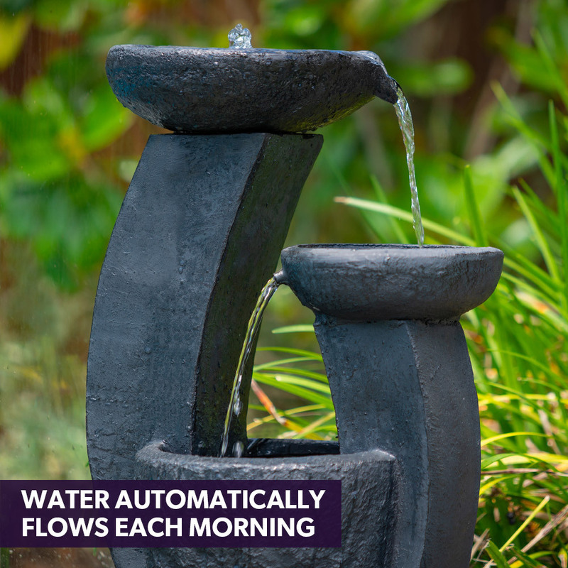 Create a beautiful calming zen ambience in any garden with this Cascading Outdoor Solar Powered Water Feature from PROTEGE. This beautiful water fountain is crafted from premium Polyresin for a modern stone aesthetic and carefully crafted features, without the weight or risk of chipping. This freestanding design is easily assembled without tools in less than 5 minutes and is perfect for contemporary alfresco spaces. It is filled with 10 litres of water to ensure stable and secure positioning.