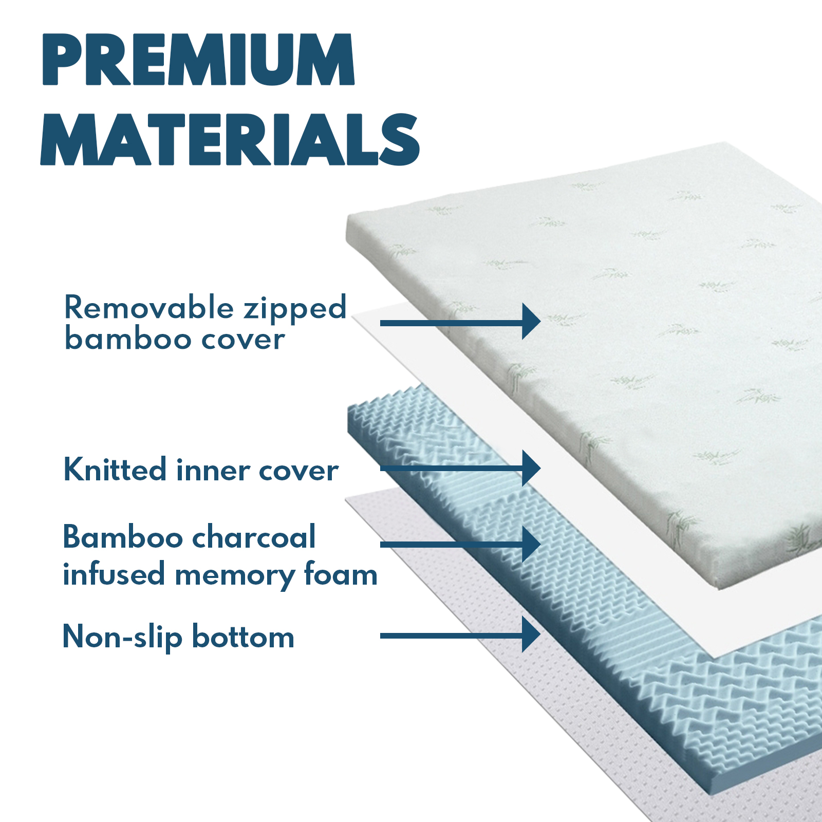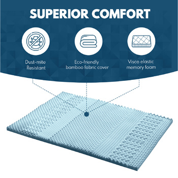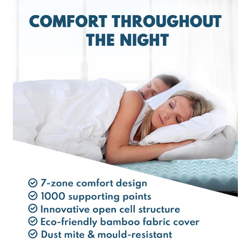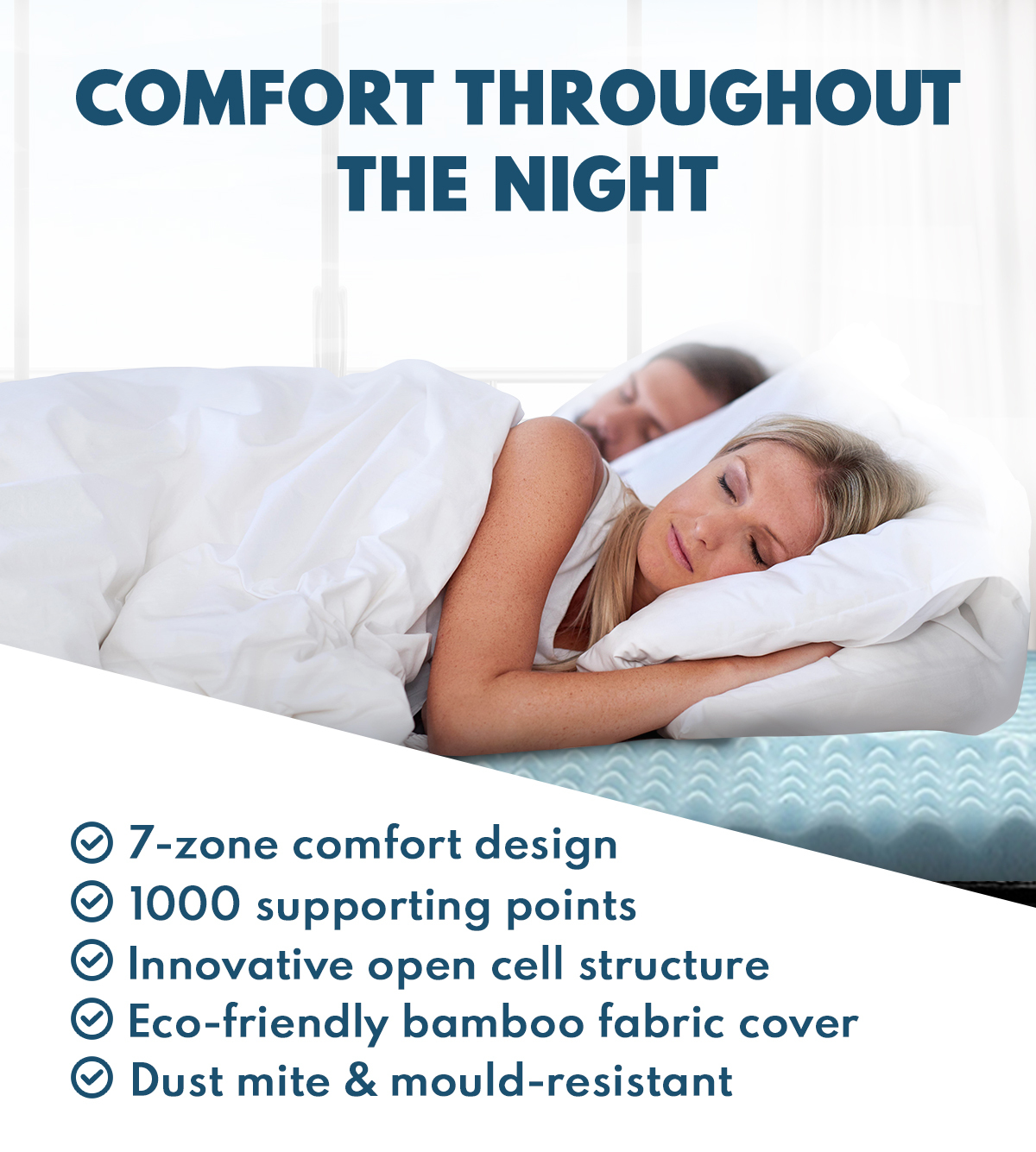 Reward yourself with a cooler and more comfortable sleep using the new Memory Foam Mattress from Bargains Online. A 5cm thick topper made with 60kg 100% visco elastic cool gel memory foam, which provides an exceptional softness during every use. It also features a 7-zone contoured design with an innovative open cell structure which offers better heat dissipation and just the right amount of temperature for a soothing sleep at any time of the day. An outstanding sleep companion especially made with over 1000 supporting points designed to shape according to the contours of your body for an even weight distribution throughout the mattress. Not least, it is wrapped with a removable and washable eco-friendly bamboo fabric cover thoughtfully made with dust mite and mould-resistant materials for a cleaner and more refreshing sleep all night long.