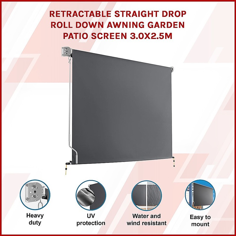 Retractable Straight Drop Roll Down Awning Garden Patio Screen 3.0X2.5M