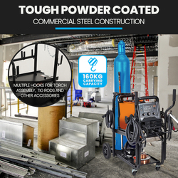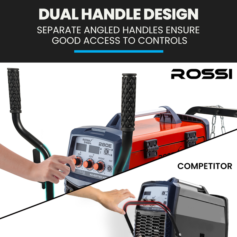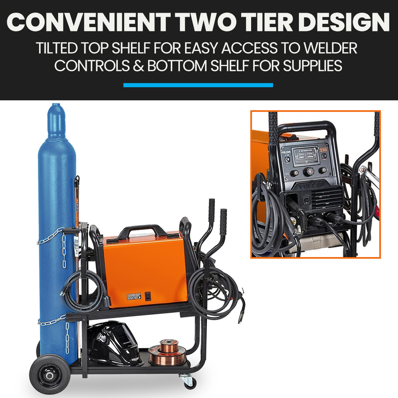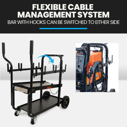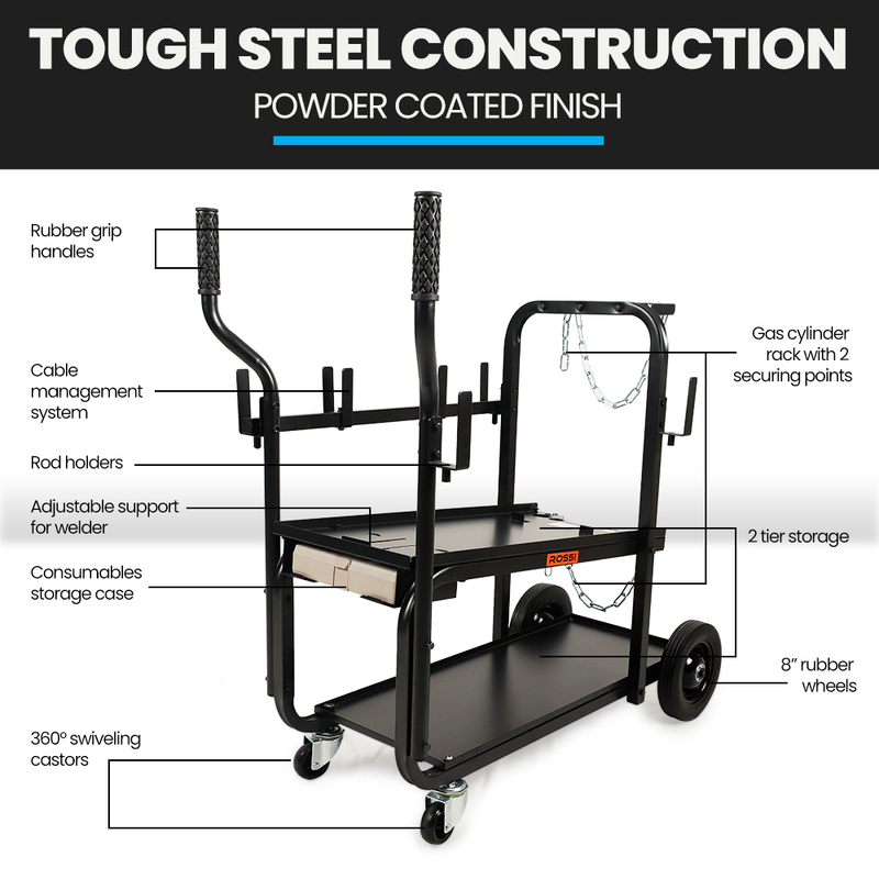 The ROSSI’s innovative design ensures everything has been considered; from a modular system that allows you to hold cabling on either side, to the individual angled handles that don’t hinder access to welder controls! The titled welder tray makes access to controls even easier, and the dual shelf design affords plenty of space for storage accessories, like your helmet and wire.