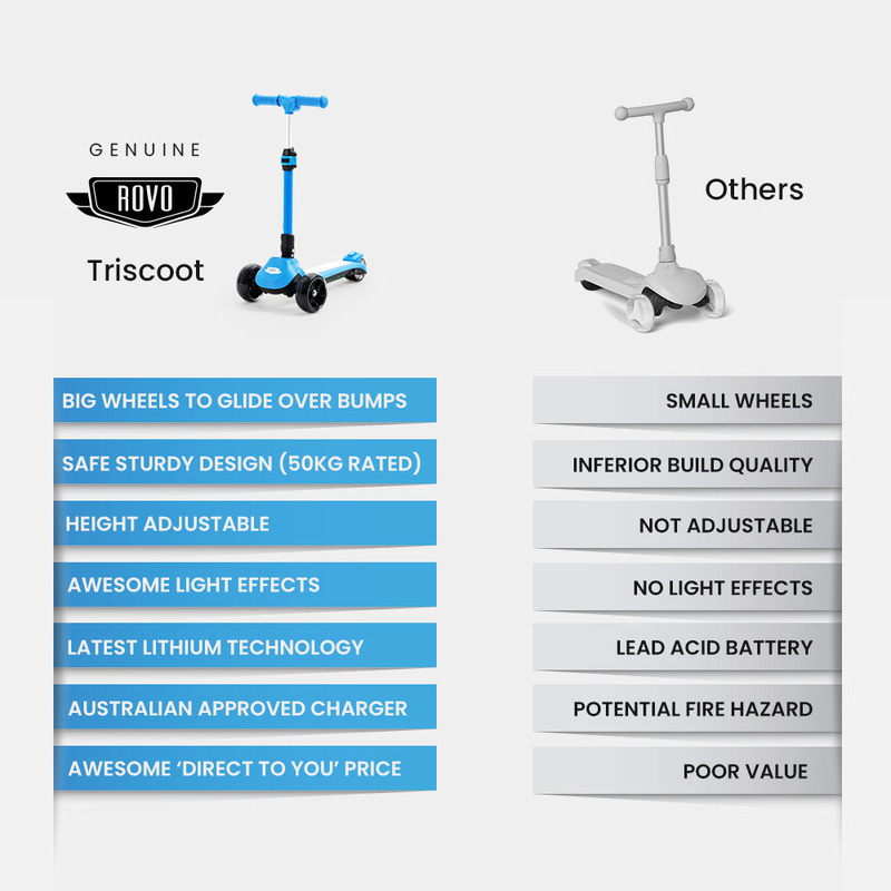 Unlike other lead-acid based models, the Rovo Kids TriScoot offers the latest advanced technology with a typical runtime of an hour. The scooter and charger are fully Australian Approved for your peace of mind.