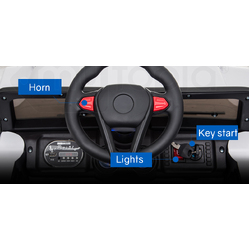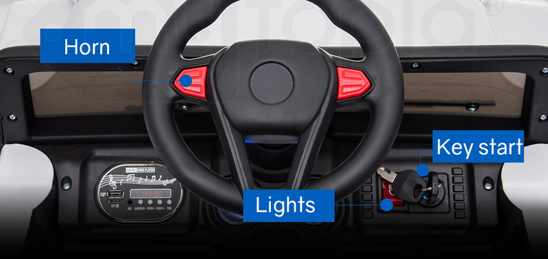 Despite the serious looking exterior this vehicle is simple to control, and boasts an array of features for maximum fun including a sensible 3-5km/h speed range, forward and reverse motion, lights and a horn.