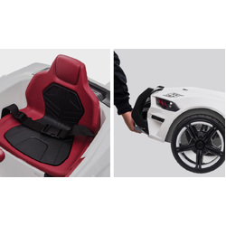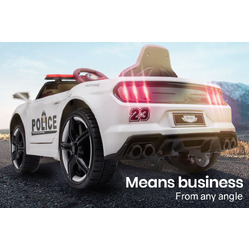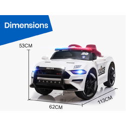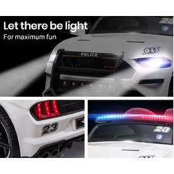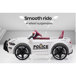 The Mustang Style Police Car features soft start which provides sensible acceleration. A 12V battery and twin motors offer unmatched range. The large wheels sport a rubber grip to stick to slippery surfaces and features a suspension to absorb harsh terrain.