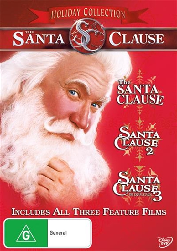 Santa Clause, The: Special Edition (1994) Superstar comedian and Golden Globe winner Tim Allen shines bright in Disney's magical, larger-than-life hit comedy that People Magazine dubbed "the most playfully amusing, inventive cinematic...fable in several decades!"Rooftop clatter leads to merry adventure after Santa falls down on the job, and Scott Calvin's son Charlie convinces dad to try on the red suit. Eight reindeer pilot the pair to the North Pole, where they soon discover that by donning the famous suit, dad must now accept all of Santa's duties! Over the next year, a surprised, not-so-jolly Scott grows a Santa-sized tummy and beard, causing friends, family and business associates to wonder if he's lost his marbles. All except Charlie, who thinks his dad is perfectly suited for his new job!Each well-kept secret of the North Pole is revealed in Disney's hilarious and heartwarming tale that's "destined to become a holiday classic" (New York Post). Now you can unwrap all the magic of the holidays any day of the year!Santa Clause 2, The (2002) Tim Allen returns as everybody's favourite modern-day Santa in The Santa Clause 2. Scott Calvin (Allen) has been Santa Claus for the past eight years, and his loyal elves consider him the best one ever. But Santa's world is turned upside down when his son Charlie lands on this year's "naughty" list, and Scott finds out if he doesn't marry by Christmas Eve - just a month away - he'll stop being Santa forever.Embracing Christmas with all its heart, warmth, fun and adventure, The Santa Clause 2 is the perfect holiday classic for the entire family.Santa Clause 3, The: The Escape Clause (2006) Tim Allen is back in the big red suit for more adventure and laughs in Disney's hilarious family comedy. Get ready for a thrilling sleigh ride as the reluctant Santa Claus faces his most chilling and hysterical challenge yet. As Christmas nears, Scott Calvin invites his in-laws (Ann-Margret and Alan Arkin) to