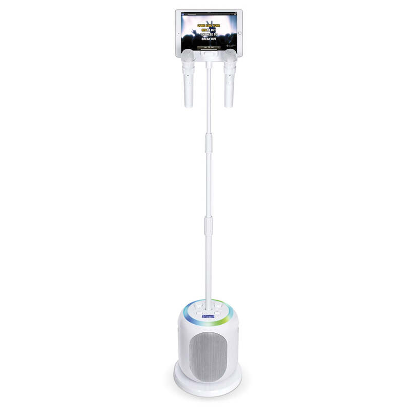 - Microphone stand can be used with the main unit or set up separately and includes device holder for phone or tablet