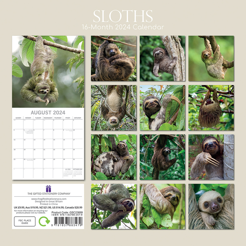 Sloths - 2024 Square Wall Calendar Pets Animals 16 Months New Year Gift Planner