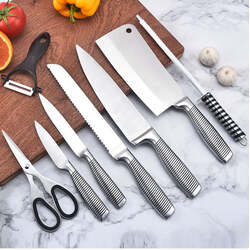 A specialized set of stainless steel knife sets for all your chopping needs. Includes Chef knife, Utility knife, Cleaver knife, bread knife, Scissor & Sharpener.