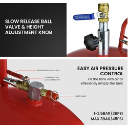 A built-in oil level indicator allows you to easily keep track of your tank capacity, and its steel wire reinforced drain pipe is abrasion, heat and ozone resistant. And, when you??e done, simply connect an air compressor via the standard ?' NPT fitting to efficiently push out the waste oil.
