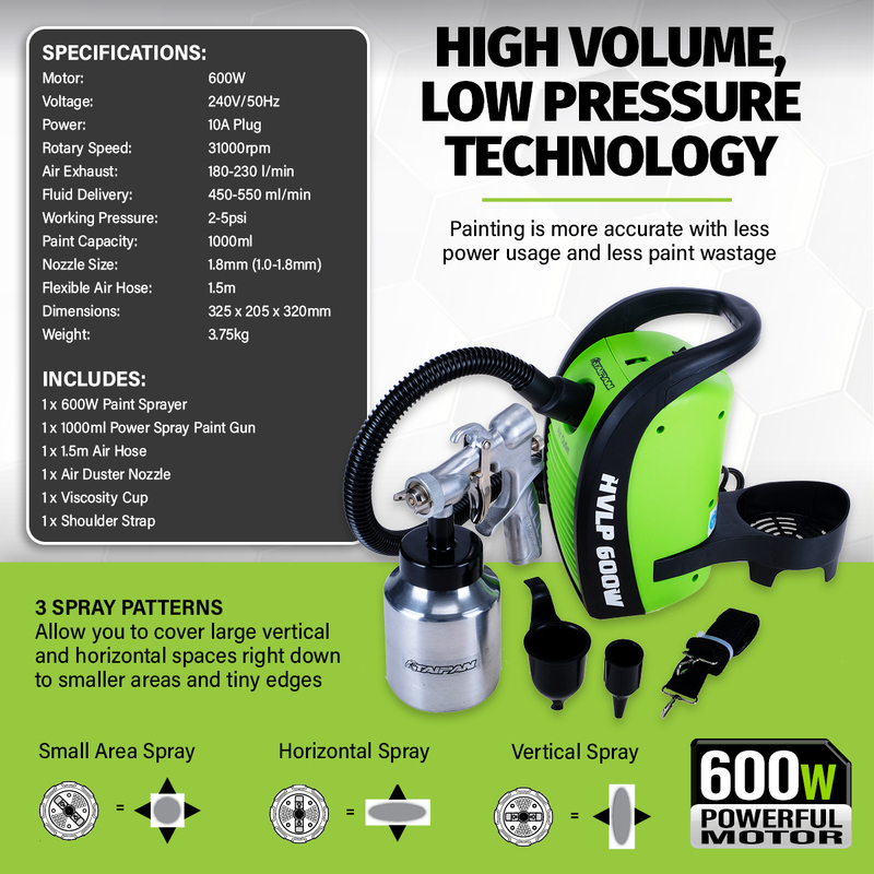 Taipan This impressive paint spray gun with an exceptional 600W powerful motor is ideal for getting all of your painting tasks completed fast and efficiently. Fitted with a stable paint outlet valve system, this paint gun ensures accurate painting with less paint usage. Boasting 3 spray patterns allowing you to cover all areas required, this paint spray gun includes all the necessities to get the job done.
