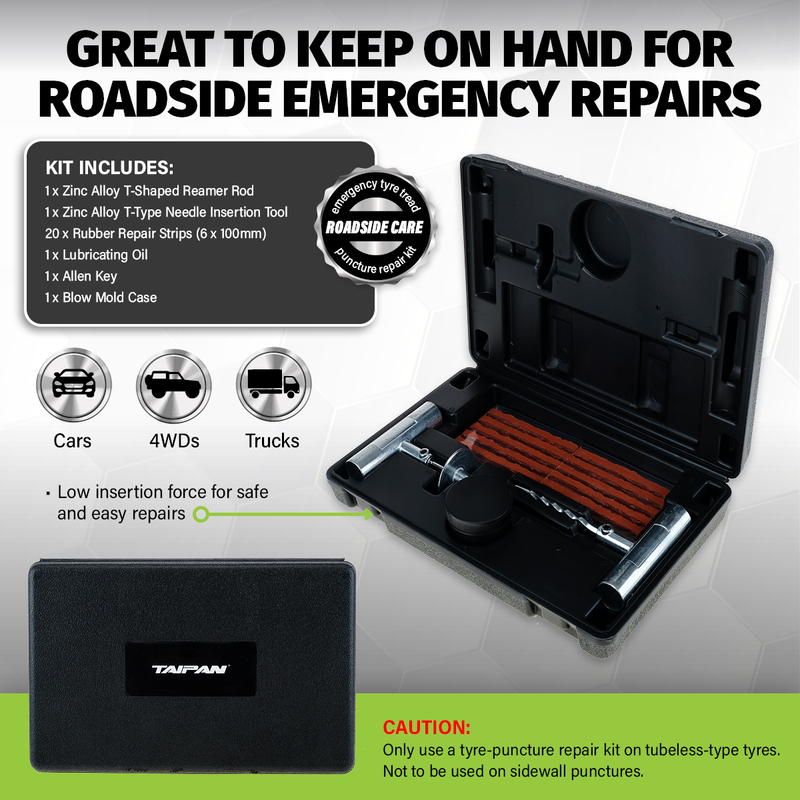 Taipan This impressive tyre puncture repair kit is ideal to have available in your vehicle in the event of a roadside emergency. Suitable for cars, 4WD\'s and trucks, this repair kit contains all the necessities required in its own moulded case.