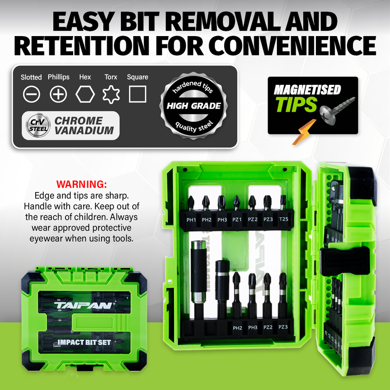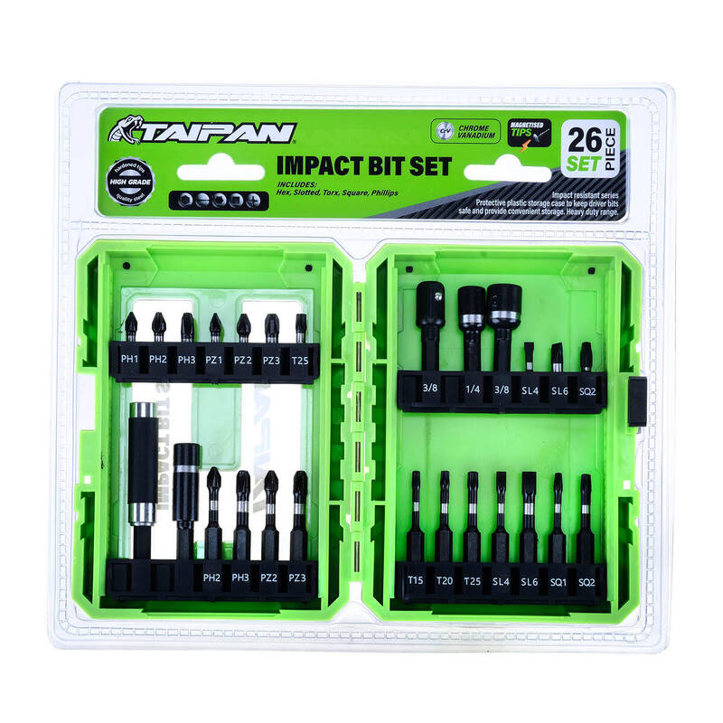 Taipan A handy and convenient impact bit set with magnetic tips constructed with chrome vanadium steel. Included is an impact resistant case with inner labelling to easily choose your required piece. Great for repairing and assembling various tasks and projects swiftly and effortlessly.