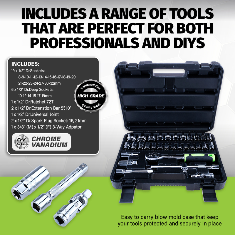 Set Contains: 32 Assorted Sockets, Joints and Plugs, Adaptor, Ratchet and Extension Bar