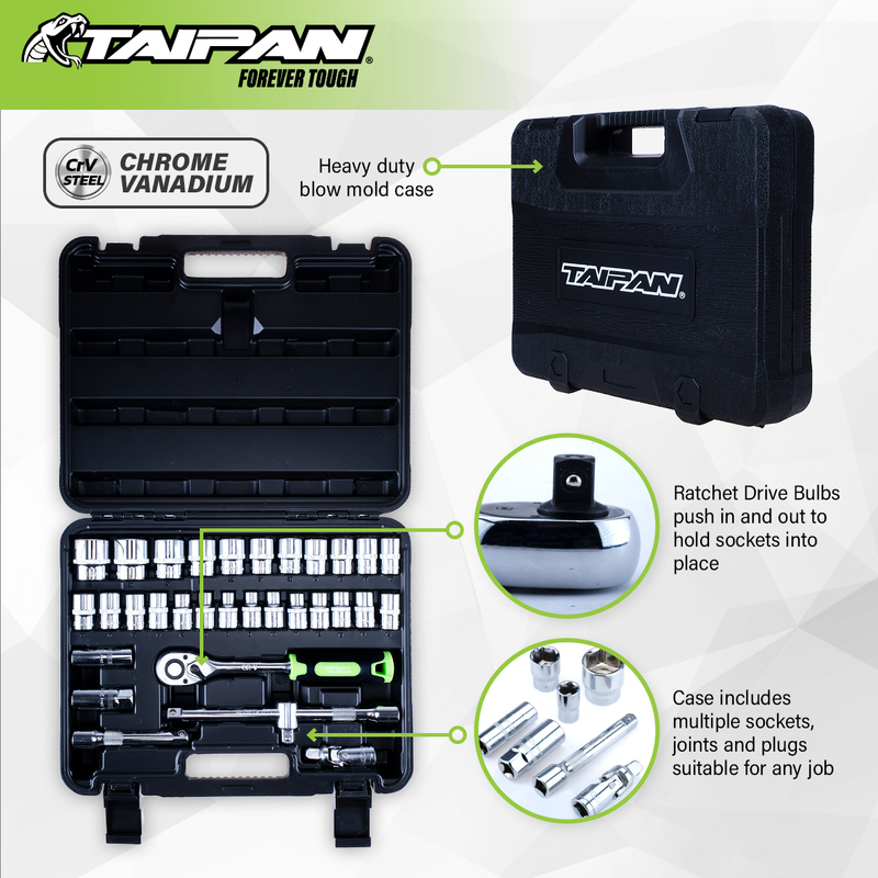 Taipan An impressive 32 piece ratchet socket set containing an assortment of handy and useful tools. Featuring premium quality chrome vanadium steel tips, this exceptional tool set has a solid and sturdy case with a convenient carry handle. All tools rest neatly and securely inside the case, making it easy to select the tool you require with ease.