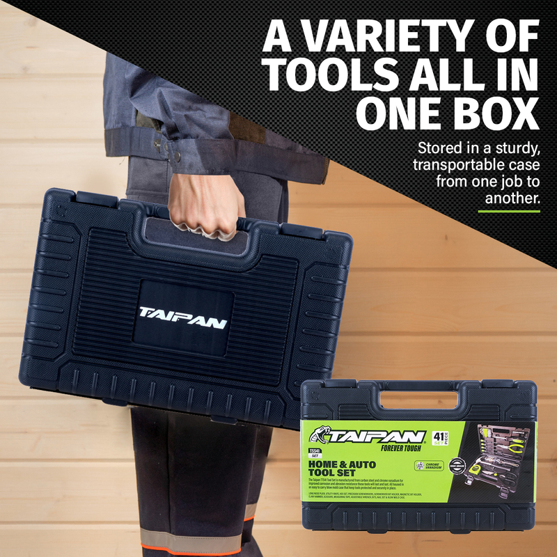Taipan An impressive home and auto set containing an assortment of handy and useful tools. Featuring premium quality chrome vanadium steel tips, this exceptional tool set has a solid and sturdy case with a convenient carry handle. All tools rest neatly and securely inside the case, making it easy to select the tool you require with ease.