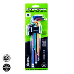 Taipan An impressive 9 hex keys, long arm set that includes its own caddy storage case. Fitted with ball ends and l-shaped handle, this hex set is colour coded for easy identification. Constructed for strength and durability, these are ideal for mechanics, engineers and DIY enthusiats.