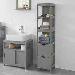 - This tall cabinet is the perfect storage solution for any room. It features 3-tiers of shelves and 2 drawers, providing ample storage space for all your belongings. The padded stand ensures stability and protection for your items, making it an ideal choice for any home.