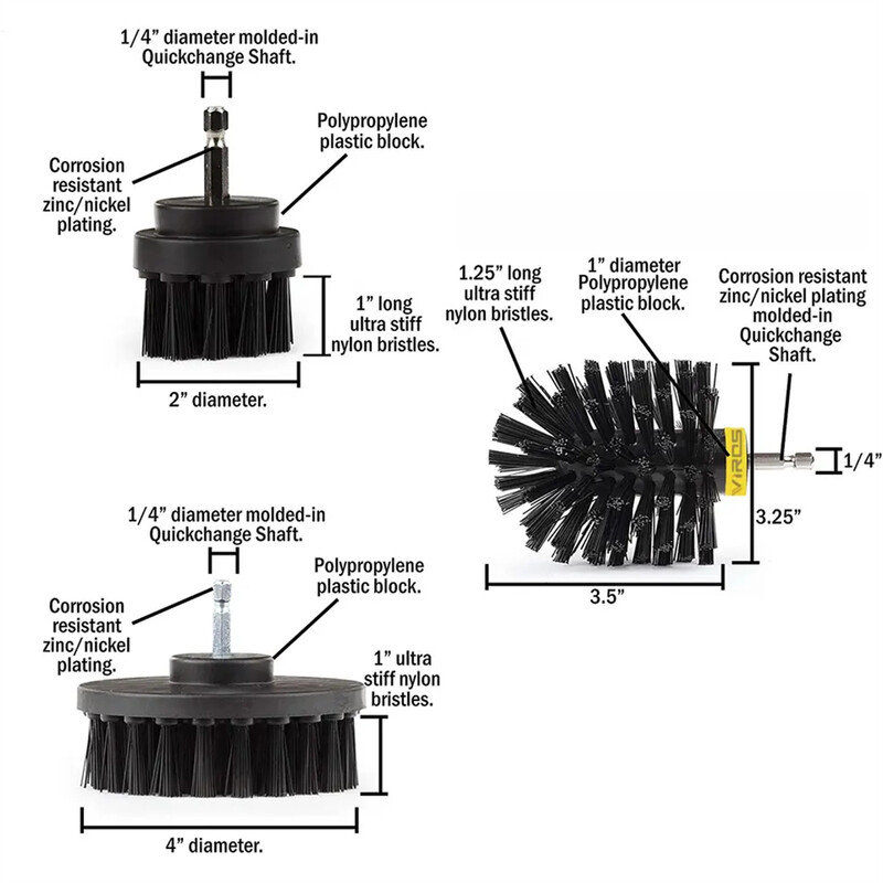 Our revolutionary drill brush attachment - the ultimate solution to all your cleaning woes. With this powerful tool, you can say goodbye to manual scrubbing and hello to effortless cleaning. Our brush attachment features medium stiffness nylon bristles that are gentle enough to avoid scratching your delicate bathtub and shower tile surfaces, but strong enough to effectively scrub away excess dirt, dust, and filth. This makes it the perfect cleaning solution for any bathroom or kitchen. The drill brush attachment is designed to fit most standard cordless drills, making it easy to use and highly efficient. Whether you're looking to clean grime off your tiles or to scrub away stubborn stains from your bathtub, this brush attachment has got you covered. No more endless hours of scrubbing or back-breaking work. With our drill brush attachment, you'll get your cleaning done in no time, leaving you with more time to relax and enjoy your clean home. Don't hesitate, get yours today and experience the ease and convenience of effortless cleaning.