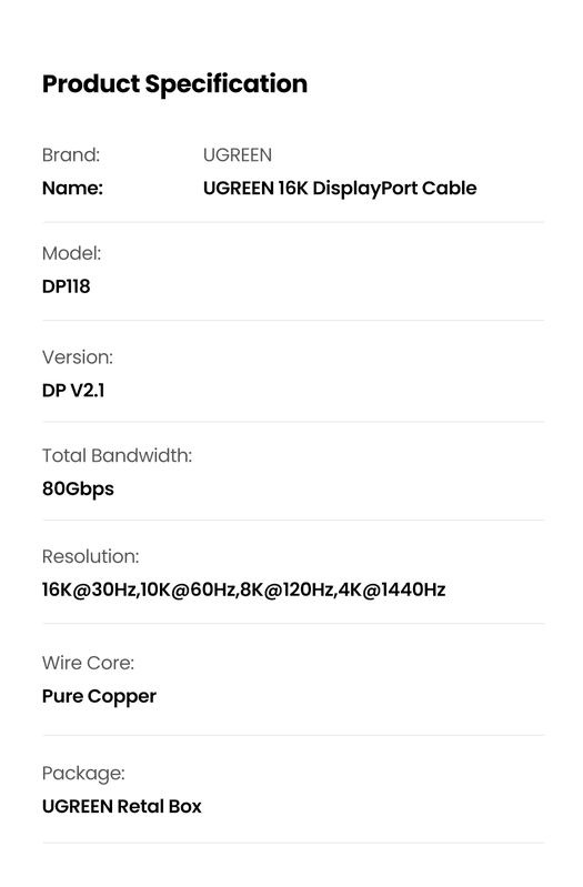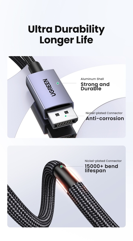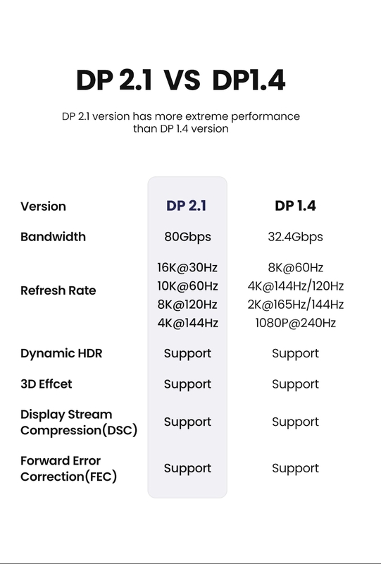 DisplayPort 2.1 Cable supports transmission speed up to 80Gbps Bandwidth, refresh rate up to 16K@60Hz, 10K60Hz, 8K@60Hz, 4K@144Hz, 2K@240Hz. UGREEN 16K DP Cable supports Dynamic HDR and HDCP 2.2. Backward compatible with DisplayPort 1.4/1.2.