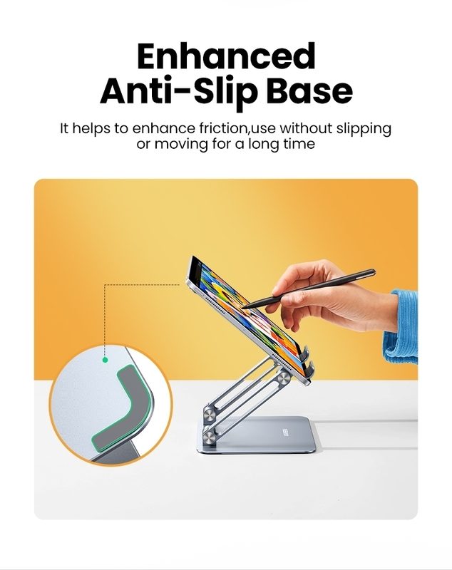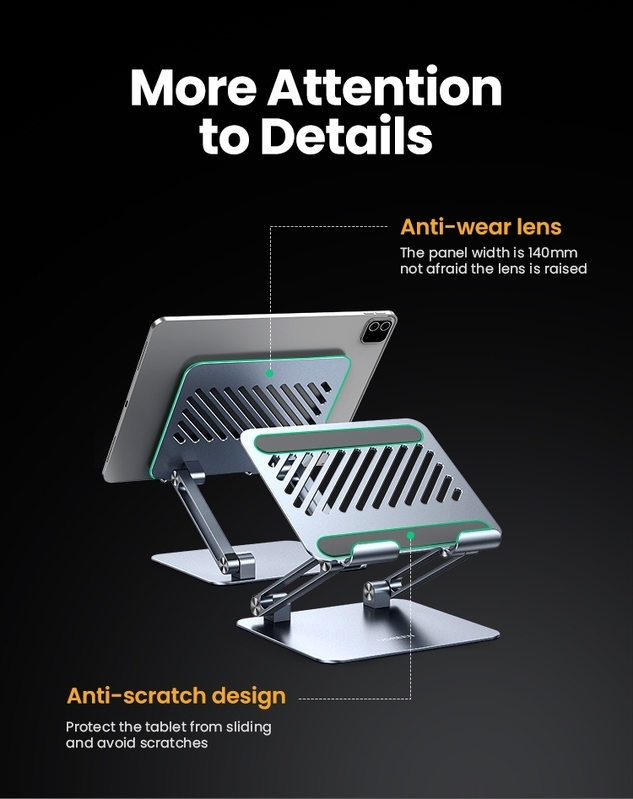 The folding laptop stand is made of premium aluminum alloy, with smooth edges, which protects your device from scratches. Provide a highly sturdy and durable silicone pad to ensure a close connection with the desktop to fix your laptop in place without worrying about shaking and slipping