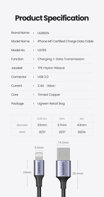 UGREEN iPhone charger cable charges your phone at speed up to 5V/2.4A(max), full charge your iPhone X in 2 hours, saving time for you on charging. With a built-in chip, do no harm to your battery, over-voltage protection function protects your iPhone at all times.