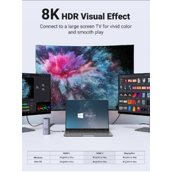 USB C docking station HDMI2 port supports up to 8K@30Hz in Windows, and up to 4K@60Hz in Mac OS.Connect via all three simultaneously to enjoy crystal-clear streaming or mirroring across 3 displays.
