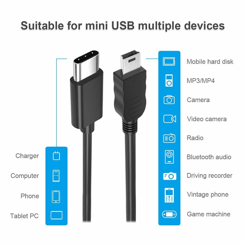 mini USB to type c cable can provide 2A(Max) current fast charging for devices, supports data transmission USB 2.0 speed up to 480Mbps(60M/s) with mini usb port.