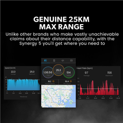 Despite a massive battery system and a heavy-duty motor, the Synergy 5??weighs in at a reasonable 12.5kg thanks to a premium aluminium frame. The frame boasts superb torsional strength for optimal handling and to prevent breakages that other models experience.