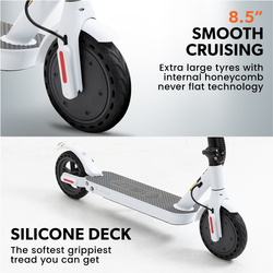 The large 8.5-inch tyres with internal honeycomb technology ensure a smooth ride, predictable handling and the benefit of never risking a puncture or requiring refilling with air!