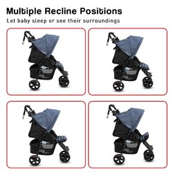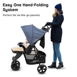 The Navigator has an easy, one-hand folding system so you can store it even while carrying your baby. The seat can be reclined all the way down to keep your little one comfy while sleeping. There is also an adjustable hood and footrest, as well as a peek-a-boo window, removable snack tray and spacious storage basket.