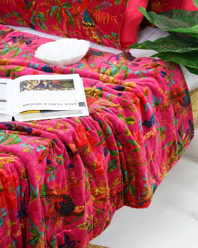 Velvet Frida Kantha Quilt Cotton Quilt Patchwork Quilt Handamade Red Velvet Floral Quilt Comforter Bedspread Blanket - Bird of Paradise Pink