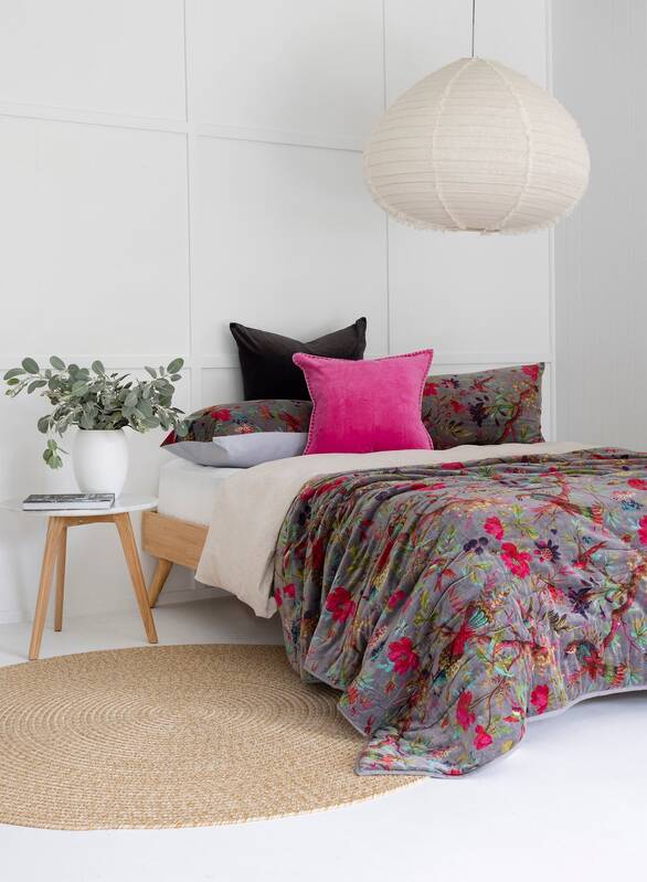 This soft plush velvet quilt reverses to equally soft cotton fabric. The light weight quilt is precisely hand quilted giving each quilt a unique texture and tonal look. Reverses to plain cotton fabric at the back. Each quilt is pre-washed for a natural and soft look. This cozy cotton quilt can be used as a bedspread, coverlet or blanket all year long.
