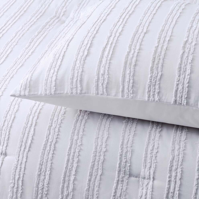 Change the look of your bedroom by adding some texture with the Reflections White 3 Piece Comforter Set by Vintage Design Homewares. This comforter set is made from 100% cotton cover with 100% Polyester filling, keeping you comfortable all night long. Our design features chenille stripes running down the comforter and pillowcases with quilted horizontal stripes adding that chic, minimalist style.