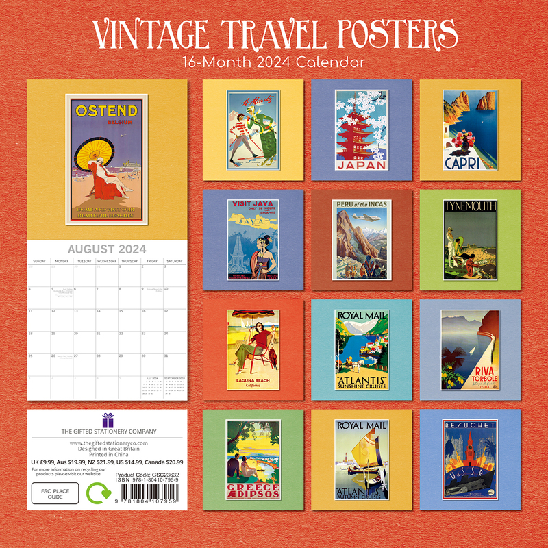Vintage Travel Posters - 2024 Square Wall Calendar 16 Months Arts Planner Gift