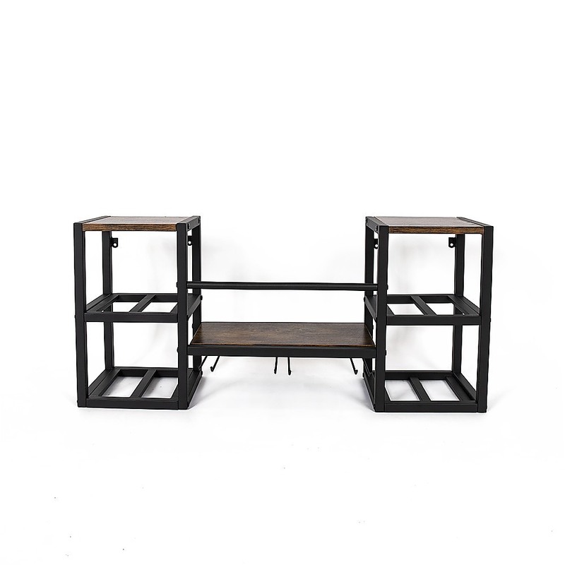 Introducing our versatile storage shelf that serves as a wine bottle holder and stemware rack, capable of accommodating up to 16 bottles of your favorite wine. It also features a hanging glass holder for added convenience. The top shelf offers additional storage space, perfect for displaying decorative items like plants, vases, and books.