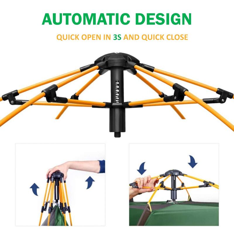 ??etup in Seconds Automatic Tents??ery fast to pop up and take down, the poles and tent material are joined permanently to the poles, and the poles only partly break down, opening it up is as easy as opening an umbrella. Save your time to sort out your poles and flysheet.