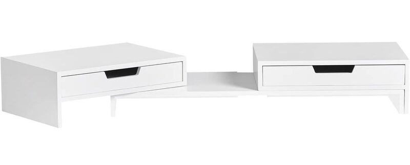 - Organize your workspace with this convenient storage solution. This product features two drawers that can be separated and rotated for easy placement of two monitors. Keep your desk neat and tidy while enjoying the added convenience of adjustable drawers.