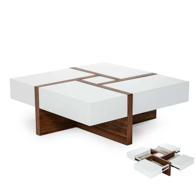 White and Brown coffee table with smooth, glossy, elegant finish. The well-designed coffee table features white blocks creatively segmented which open to give 4 individual storage drawers.