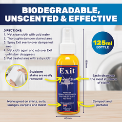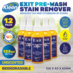 X-tra Kleen?? Exit stain removing pre-wash spray is an amazingly effective product that can remove the most stubborn of stains. Australian made, this spray can be used on clothing, upholstery, carpets and more. This wonder spray removes grease, blood, lipstick, biro/pen stains, shoe polish and red wine stains.