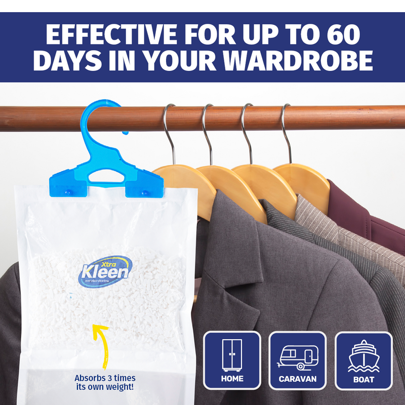 X-TRA KLEEN?? Freshly scented dehumidifier bags for use in closets, wardrobes, bathrooms and more. Absorbing up to 3 times its own weight, these dehumidifiers are effective for up to 60 days, helping prevent mould and mildew by absorbing moisture and soaking up condensation.