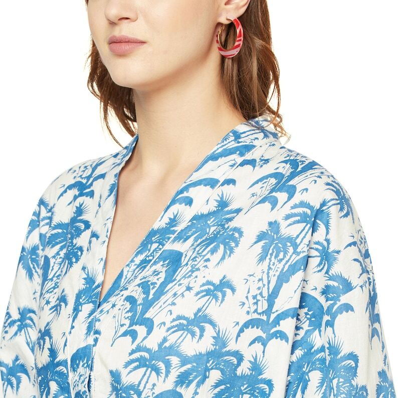 A beautiful Frida Kahlo inspired kaftan for a super price. Perfect as a kimono, robe or a kaftan. Made from super comfy light weight cotton cambric so treat yourself to ultimate comfort whether you are simply winding up at night, getting ready for the morning or just cozying up in your lounge to binge watch a movie on Netflix.