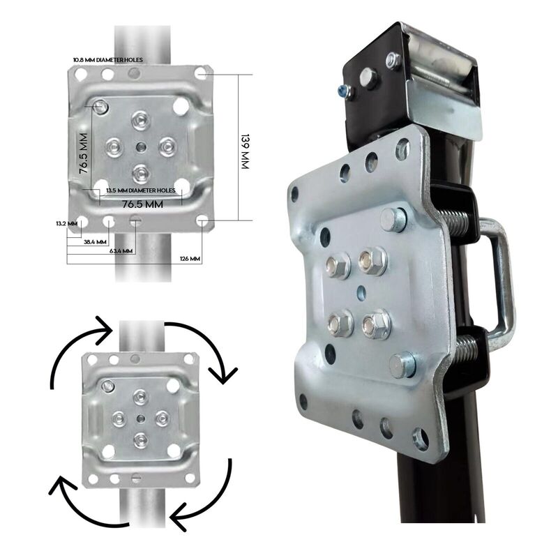 - Heavy Duty Swivel clamp plate with eight predrilled holes point suitable for drawbars up to 100mm