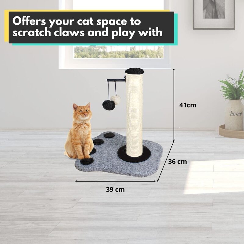 Designed to be able to entertain your cat and protect your expensive furniture. It features a scratching post and pad,and hanging fuzzy balls to play with. Sisal rope is wrap around the post for your cats to scratch. This cat scratching post and pad will provide your cat with a place to have fun, exercise, scratch especially when you have limited space.